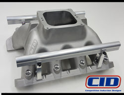 The CID Heads BE 5.0 intake manifold is designed for engine applications aiming to make 850+HP using a cast single plane intake. The CID Heads BE SB Ford intake manifold has an overall height of 9.75" and unmatched HP producing characteristics amongst all Ford cast single plane manifolds. It features a square carb pad designed to suit a 4500 Dominator carburetor or throttle body and comes set up for EFI with fuel rails and CNC billet fuel rail mounting brackets